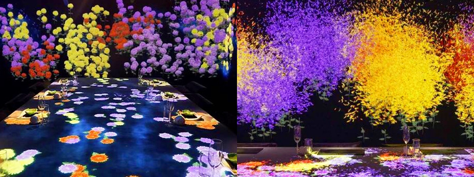 蜃境团队受邀为沉浸式互动餐厅提供多媒体技术支持,以数字化替换传统装饰,“高端餐饮输出+3D全息氛围”为亮点,利用入口多屏地面互动、电子菜单翻书、360度墙体投影和全息玻璃成像展现餐厅智能化、互动性,让消费者享受到有别于传统餐厅的全新视觉体验。